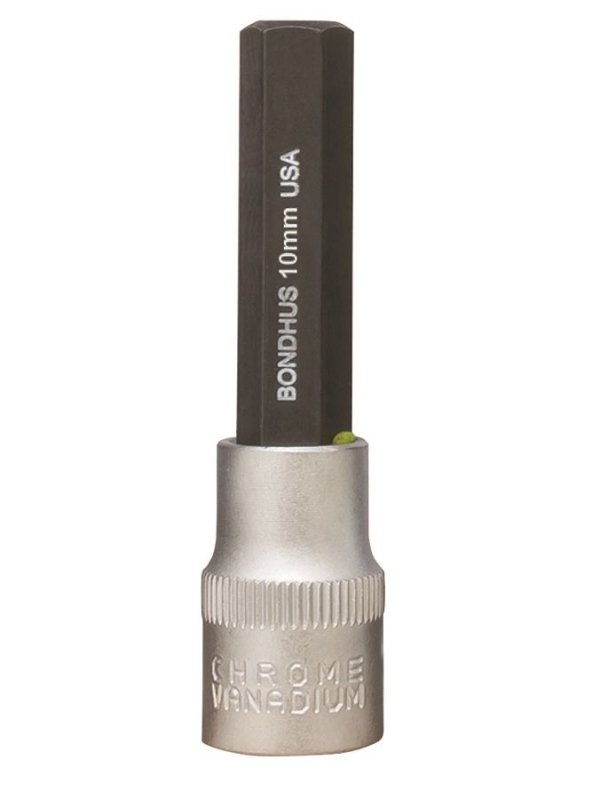 BONDHUS 9mm ProHold InHex Bit 3/8" Socket, 43274 - ProHold® Socket Hex Bit w/Socket Size: 9mm Length: 2" Socket: 3/8" DR With ProHold® Button Technology. Protanium® High Torque Steel and ProGuard™ corrosion resistant finish